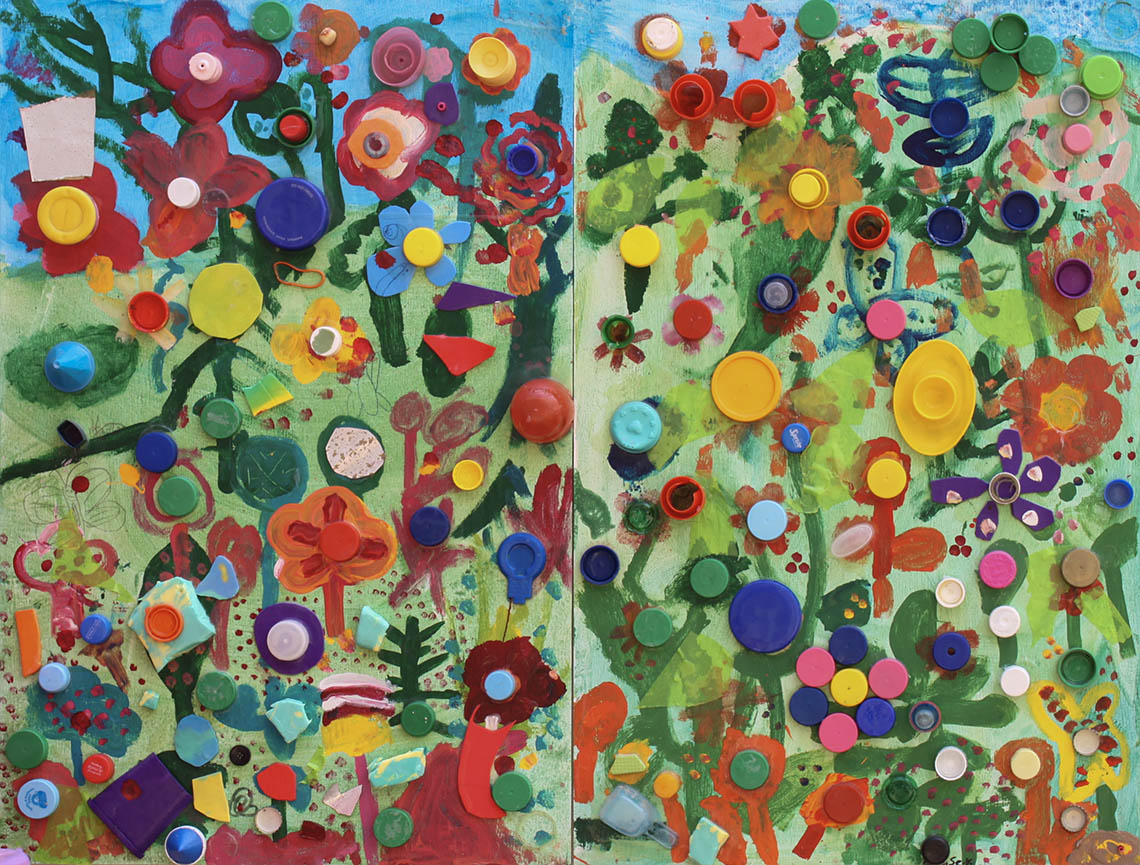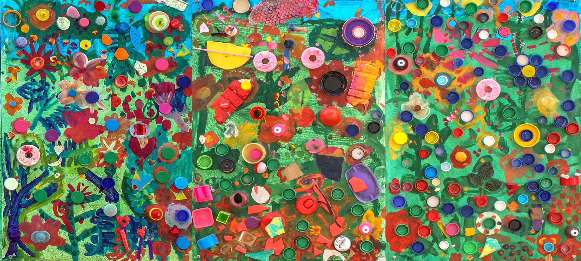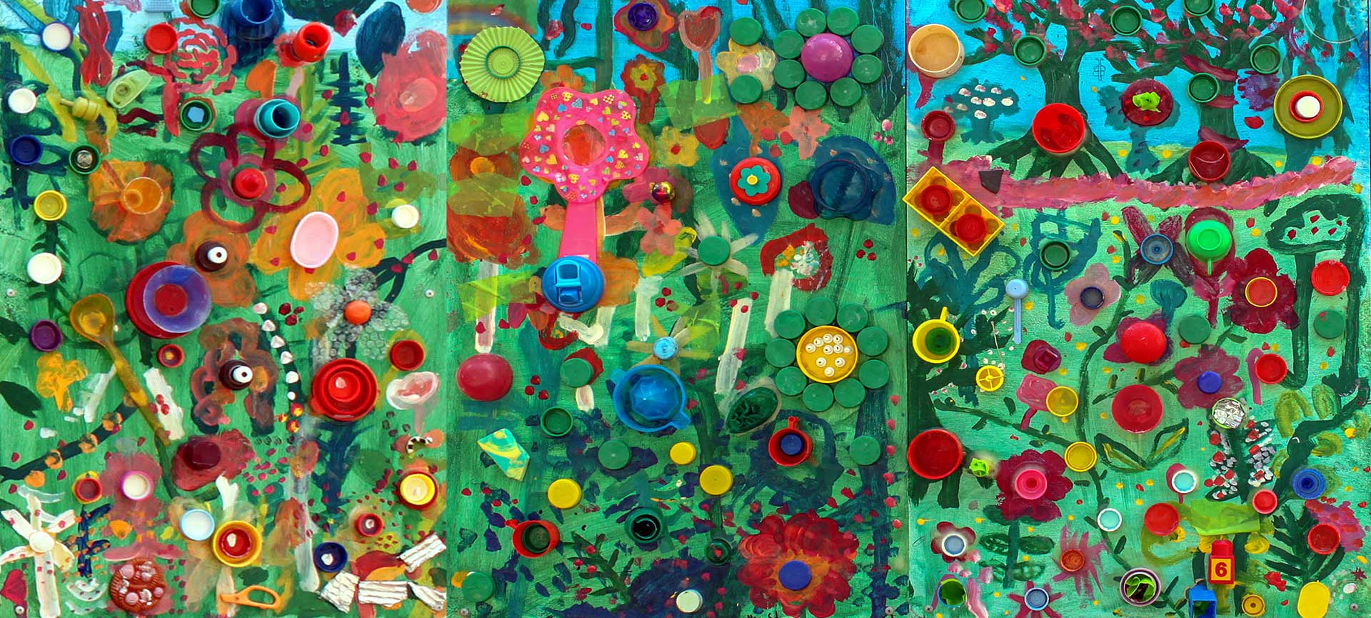 Reused plastic objects, PVA, acrylic paint on board
